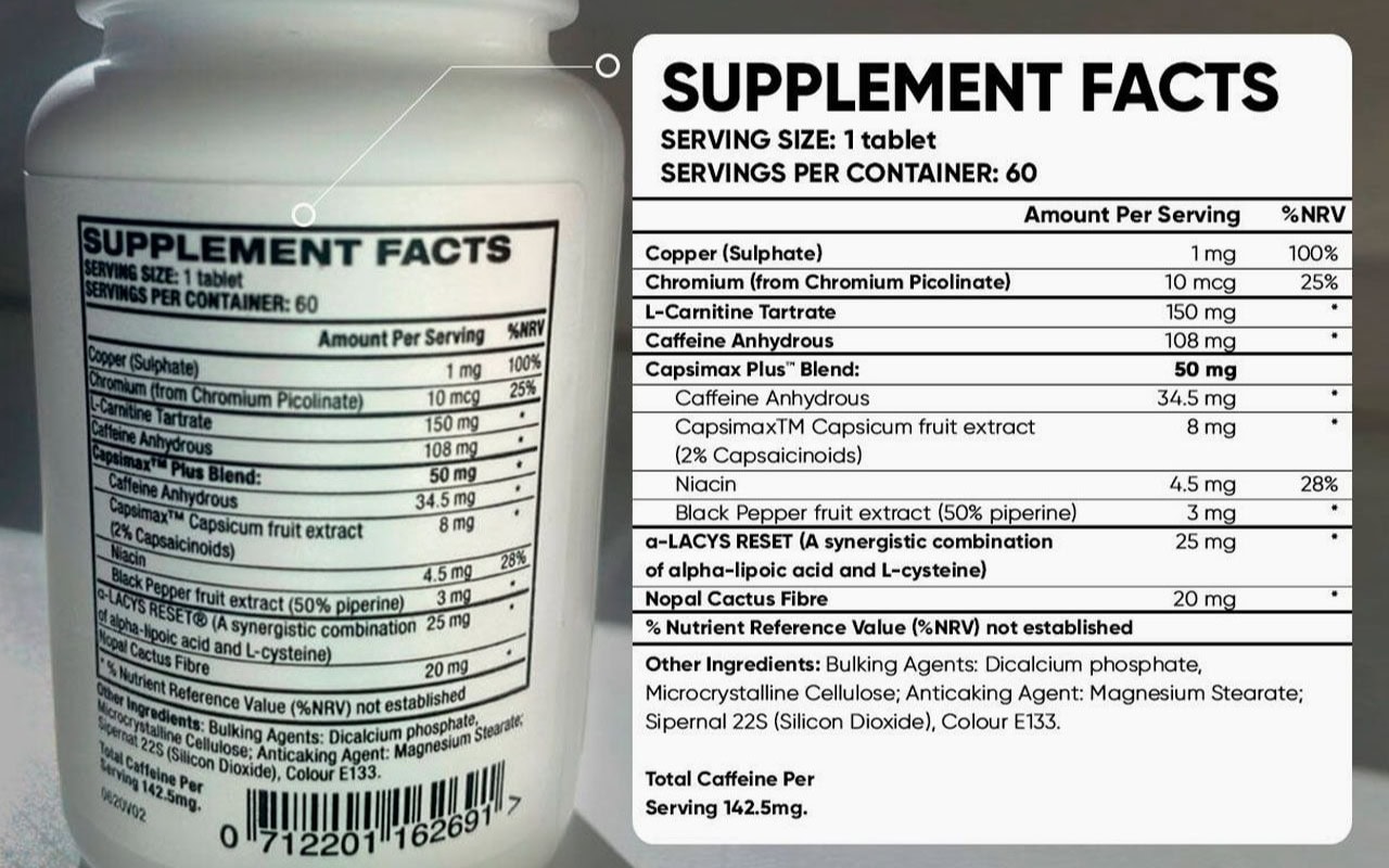 Key ingredients include Capsimax Powder, Chromium Picolinate, Caffeine, Nopal Cactus, L-carnitine Fumarate, Innoslim, B-vitamins, and Iodine.